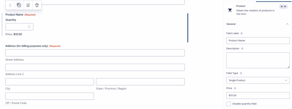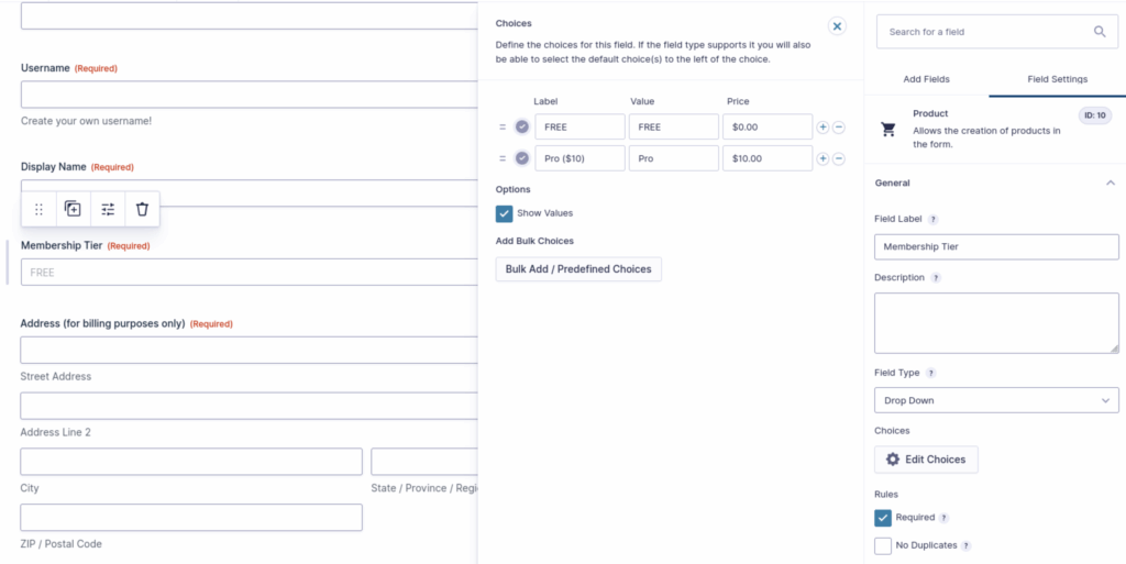 If you want to charge for memberships, you can do this in your form with a few additions. The first thing you need to do is add a Product field to your form.