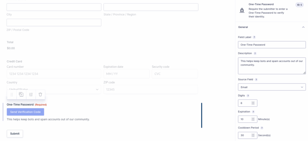 OTP sends a verification code via email or SMS. The form will only be submitted when the correct code is entered. Once you add the field to your form, there’s minimal setup required — and no coding necessary! Let’s walk through the settings.