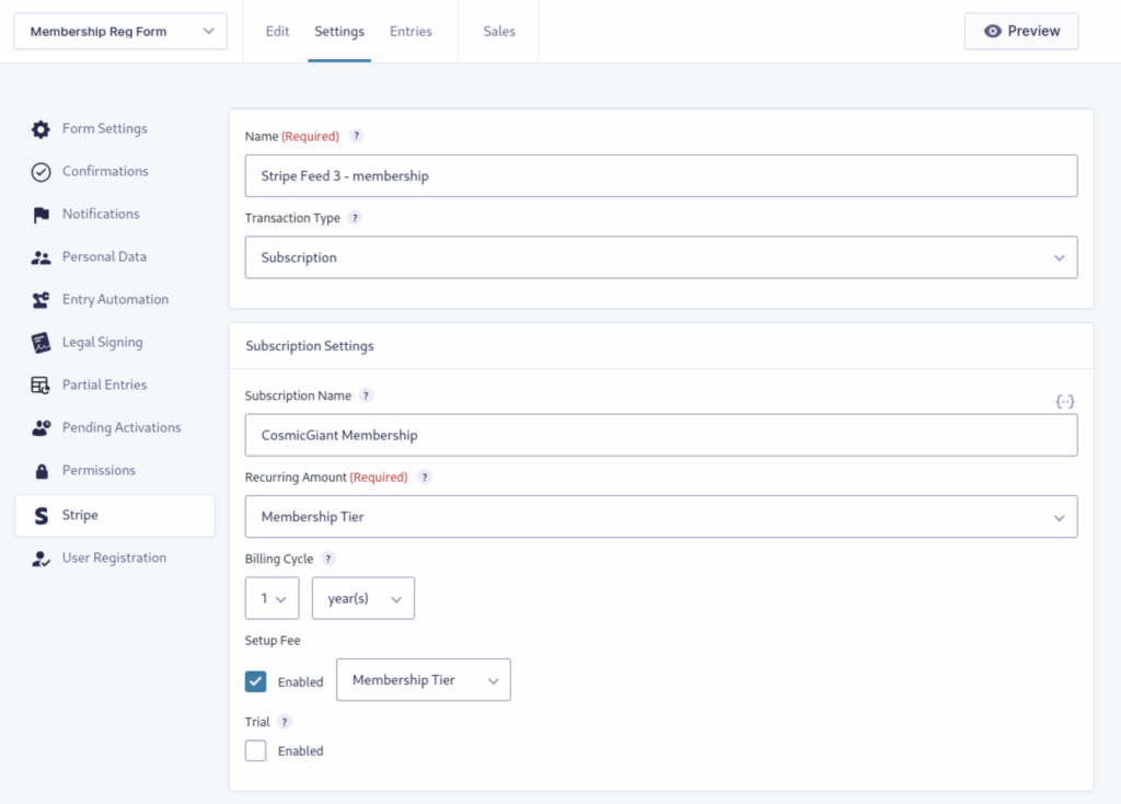 Under Subscription Settings, add the Subscription Name. Then configure the Recurring Amount and Billing Cycle selections as needed for your specific membership signup form.