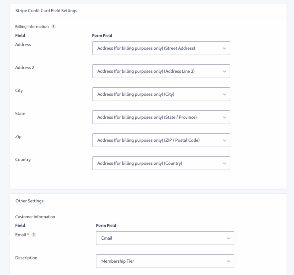 Continue by mapping the Stripe Credit Card Field Settings to the fields on your form.