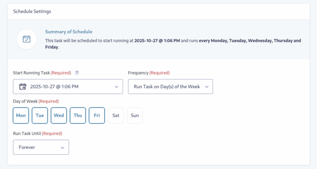 If you choose to schedule the task, you’ll need to determine how often the Task should run.