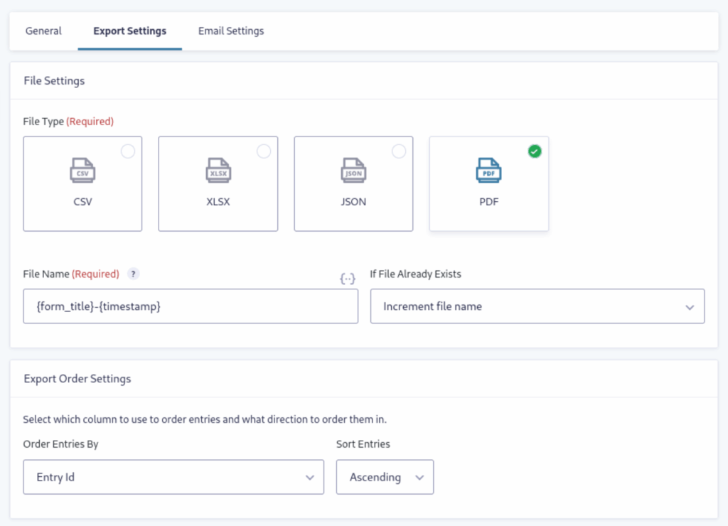 Now, choose the File Type and naming schema you’d like under the Export Settings tab. Your file type options are: