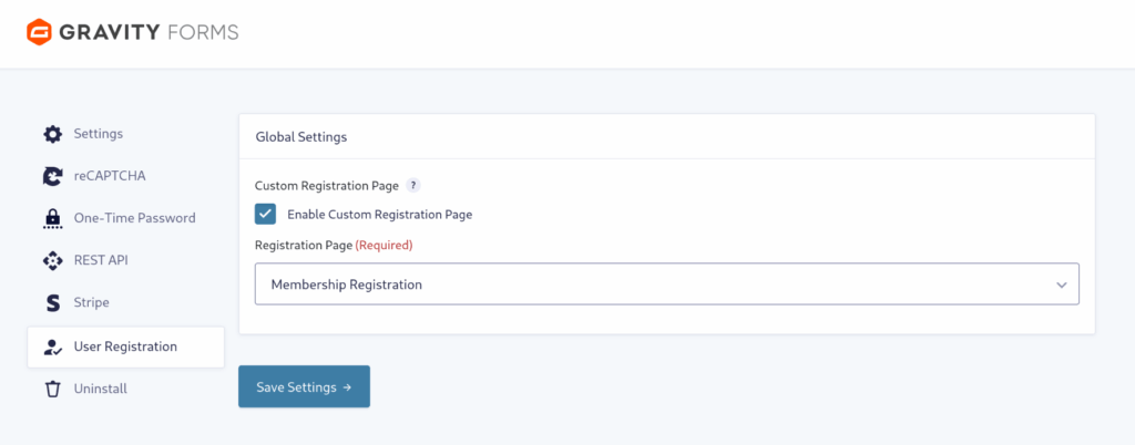 There’s a minimal amount of setup with the User Registration add-on. Navigate to Forms → Settings → User Registration. Here you can enable the custom registration page, then choose the blank page you just created.